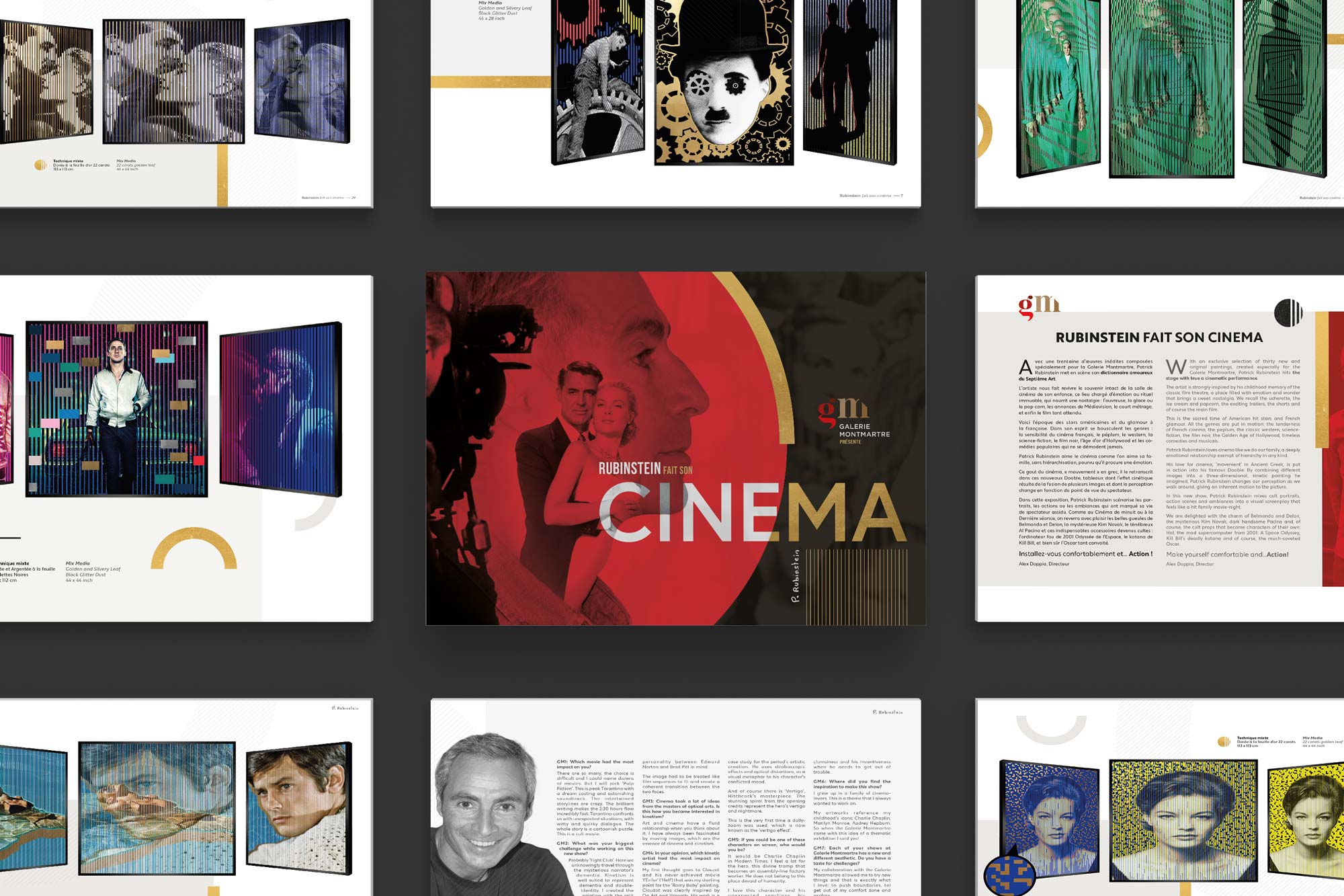 Nous avons une nouvelle fois collaboré avec la Galerie Montmartre, pour créer ce magnifique catalogue d'exposition mettant en lumière les oeuvres de Patrick Rubinstein sur le thème du 7e Art.
